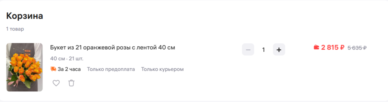 2. Клиент добавляет товар в корзину, где видит срок и условия доставки. Например, букет может приехать через 2 часа, но понадобится предоплата.