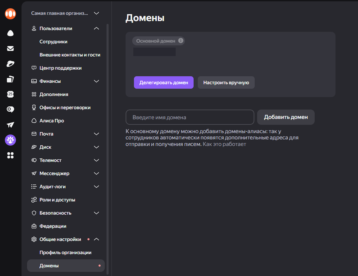 Ручная настройка записей (MX, SPF, DKIM) в панели управления DNS у вашего регистратора. Подробнее в Справке Яндекс 360