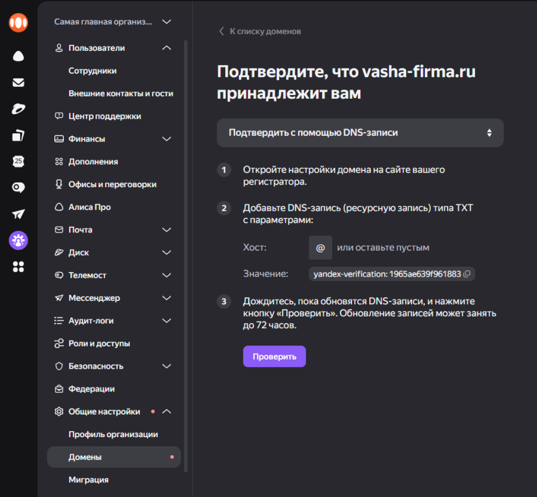 После выполнения инструкций нажмите «Проверить домен». Подтверждение может занять до 72 часов.