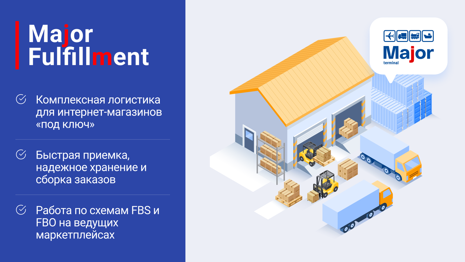 Major Terminal — 3PL-оператор с 20-летним опытом, имеющий в управлении терминалы класса «А» общей площадью 176 000 м². Major Fulfillment обеспечивает фулфилмент полного цикла для маркетплейсов и интернет-магазинов, предлагая индивидуальные решения на базе глубокой отраслевой экспертизы.