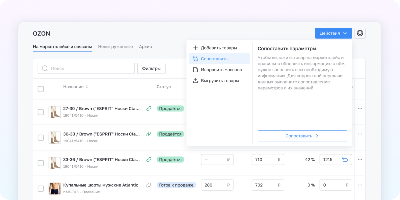 ✅ лёгкая настройка: добавляйте товары в интеграцию через кнопку «действия»; ✅ удобная подготовка: проверяйте и исправляйте ошибки в разделе «Невыгруженные» перед отправкой; ✅ гибкое управление: выгружайте товары поштучно или массово; ✅ новый раздел «Сопоставления»: настраивайте передачу данных о товарах для корректного отображения на Ozon.