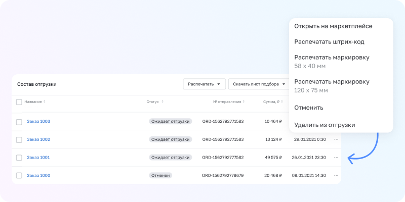 Вы сможете: ✅ изменять состав отгрузки: добавлять заказы или удалять их, если хотите отгрузить позже; ✅ печатать маркировку заказов двух размеров: 58x40 и 120х75; ✅ создавать штрихкоды товаров из отгрузки.