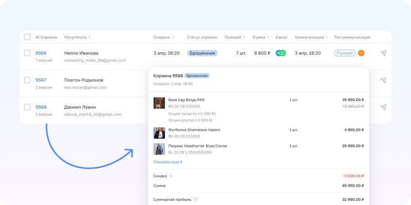 Убегающие клиенты — больше не проблема. Сервис «Брошенные корзины» напомнит, что они хотели закупиться в вашем магазине. Он автоматически ловит «беглецов», оставивших полные корзины, и отправляет персонализированные предложения через имейл, смс и мессенджеры. Больше продаж и выручки — меньше забытых покупок!