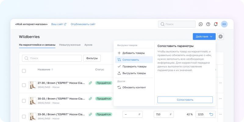 Обновили интерфейс интеграции с Wildberries, где можно выгружать товары на маркетплейс и сопоставлять их параметры. Согласитесь, выглядит здорово?