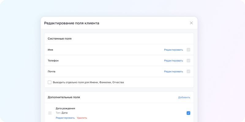 В обновлённом чекауте появилось редактирование клиентских полей. Меняйте названия, указывайте обязательность заполнения, добавляйте поле «Дата рождения» — делайте форму удобной именно для вас.