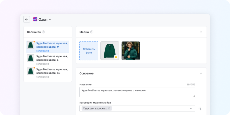 В интеграции с Ozon каждая вариация — отдельная карточка с собственным контентом
