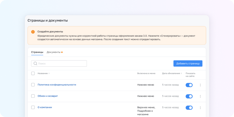 Переделали интерфейс редактирования страниц сайта и вынесли юридические документы в отдельную вкладку — публичная оферта, пользовательское соглашение, политика конфиденциальности. Создавайте их как отдельный тип страниц, а ссылки автоматически подтянутся в чекаут 3.0.