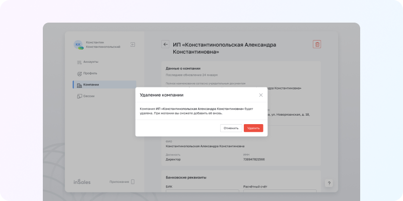 Если вы случайно создали дубль компании или она больше неактуальна, теперь можно удалить карточку самостоятельно. Заходите в личный кабинет → «Компании» → выбираете карточку → удаляете. Компании, добавленные через СберБизнес ID, удалить не получится.