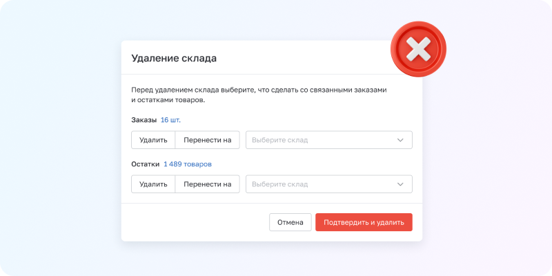 В разделе «Настройки → Мультисклад» теперь можно убрать неактуальные склады. Выбираете склад, нажимаете «Удалить» — система предложит перенести остатки и заказы на другой склад или удалить их. Удаление необратимо, так что проверьте дважды, прежде чем нажать на кнопку.