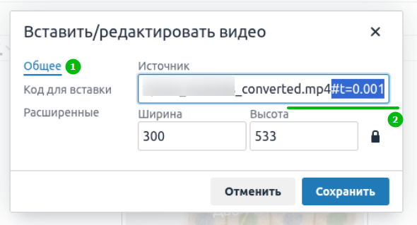 2. Выберите упомянутый выше инструмент "Вставить/редактировать видео" и вставьте в поле "Источник" скопированный адрес (1). При необходимости можно сразу задать нужные ширину и высоту ролика в пикселях (2):
