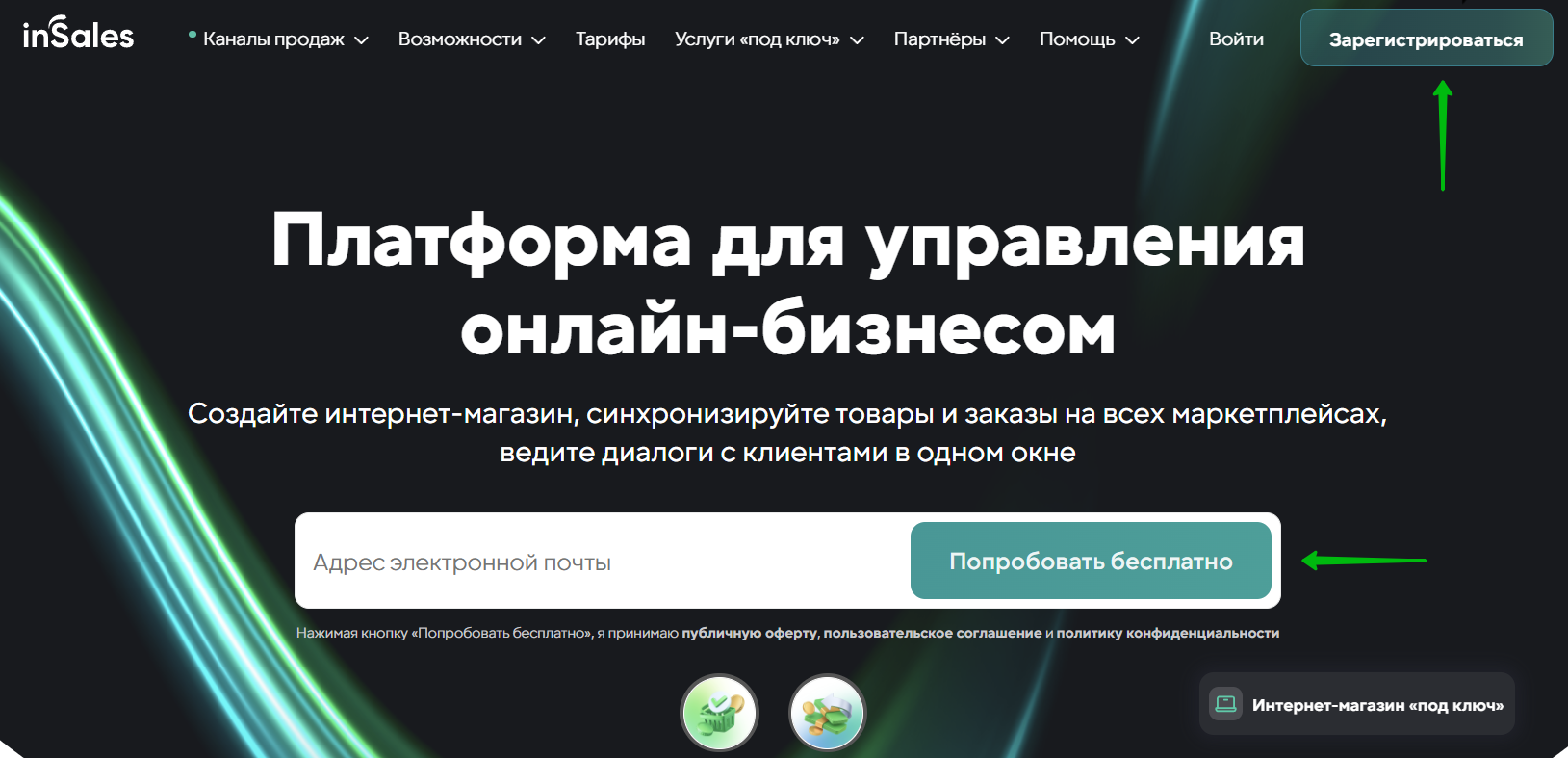 Чтобы создать собственный интернет-магазин и начать работать с ним, необходимо зарегистрироваться в inSales.