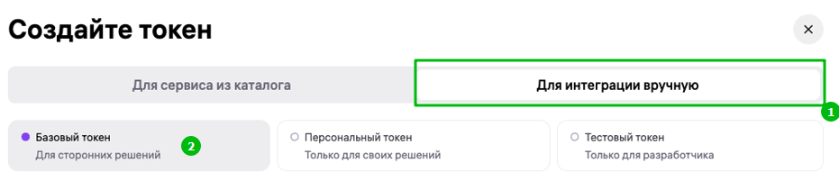 5. Перейдите во вкладку "Для интеграции вручную" и выберите "Базовый токен":