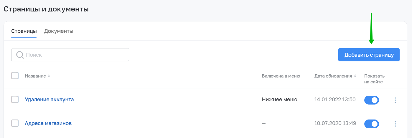 1. Чтобы создать новую страницу, перейдите в раздел Сайт → Страницы и документы: