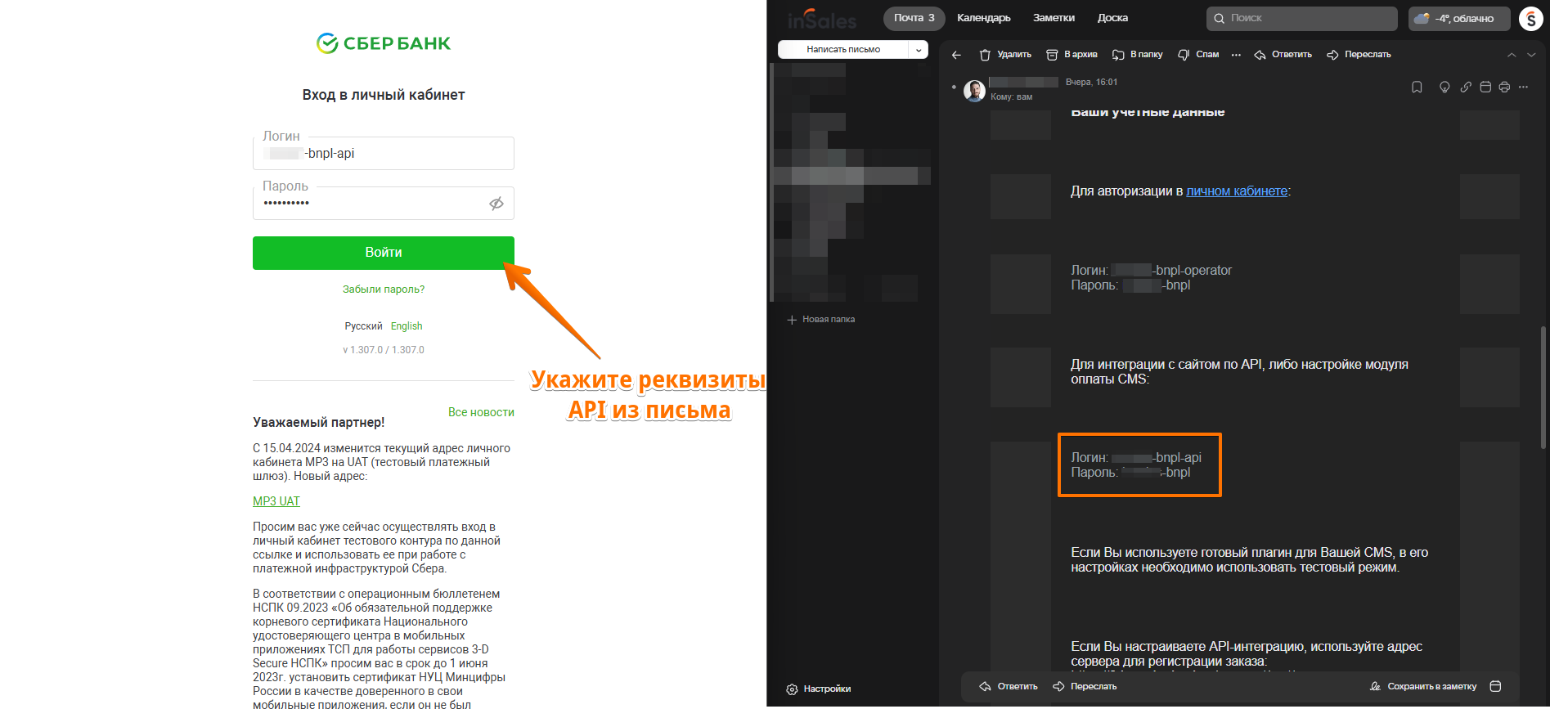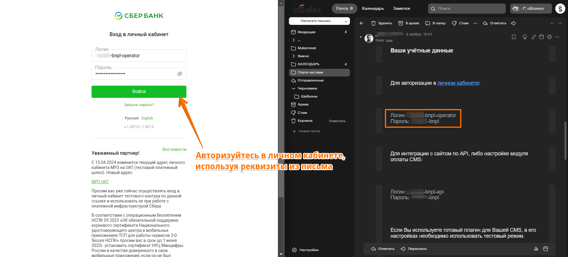 Укажите полученные от Сбера тестовые логин (он имеет вид xxx-bnpl-api) и пароль для интеграции по API: