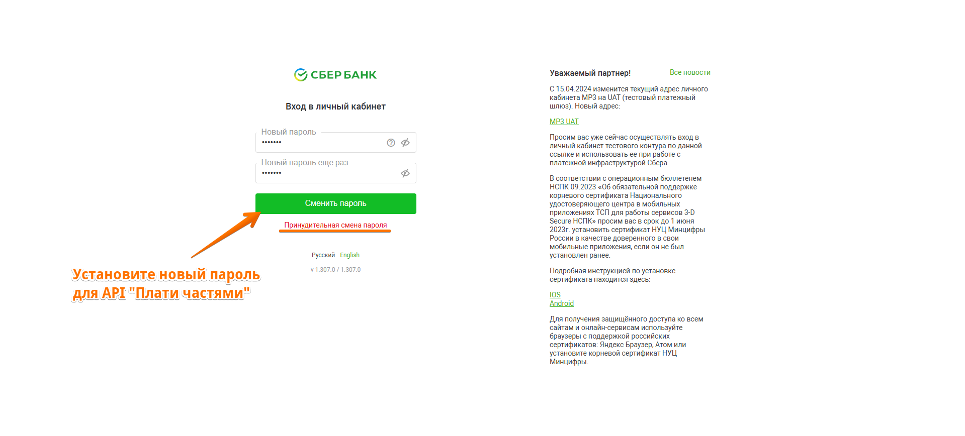 2. После проверки сайта и получения боевого логина и пароля нужно в личном кабинете "Плати частями" произвести замену временного пароля. Зайдите в личный кабинет под логином xxx-bnpl-api (где ххх — уникальный идентификатор партнера) и временным паролем, который указан в письме от Сбера.
