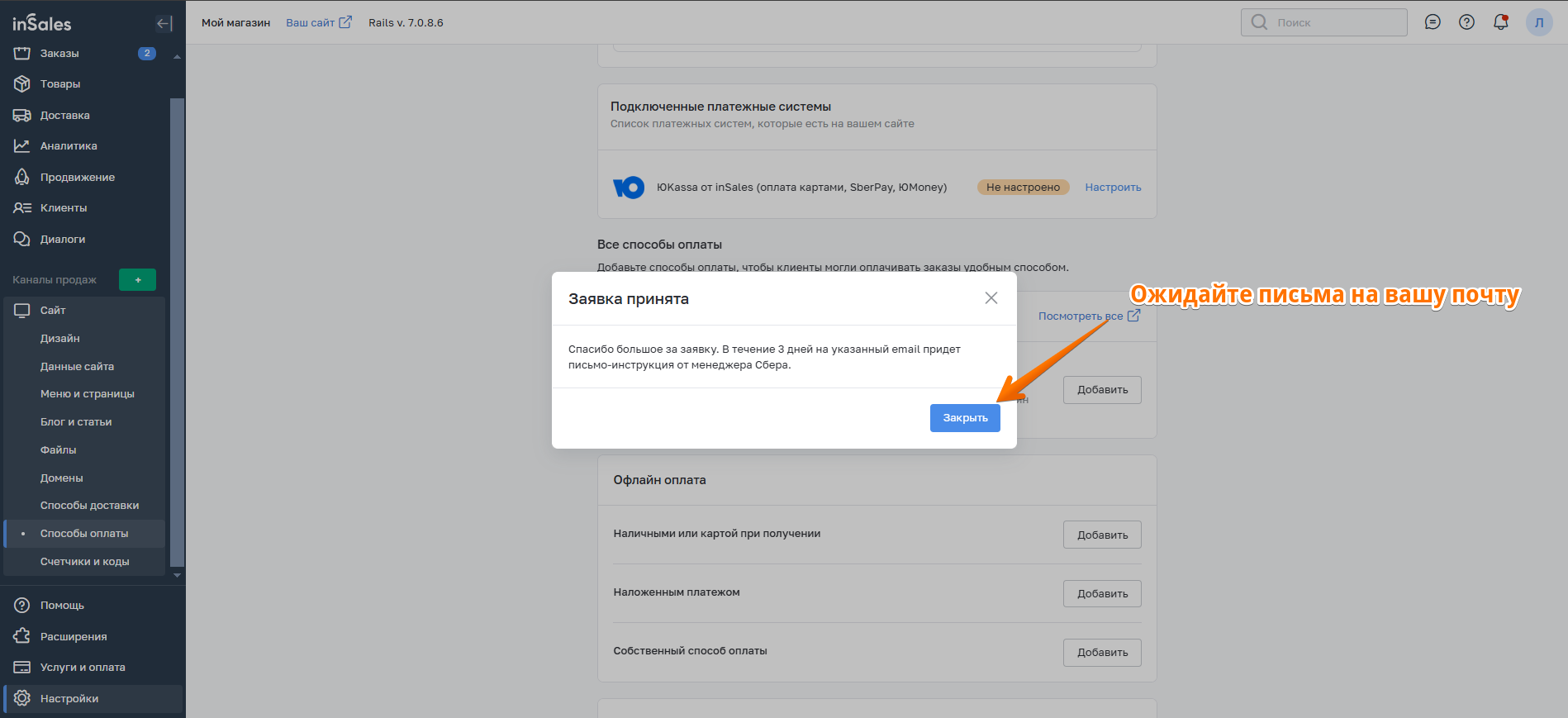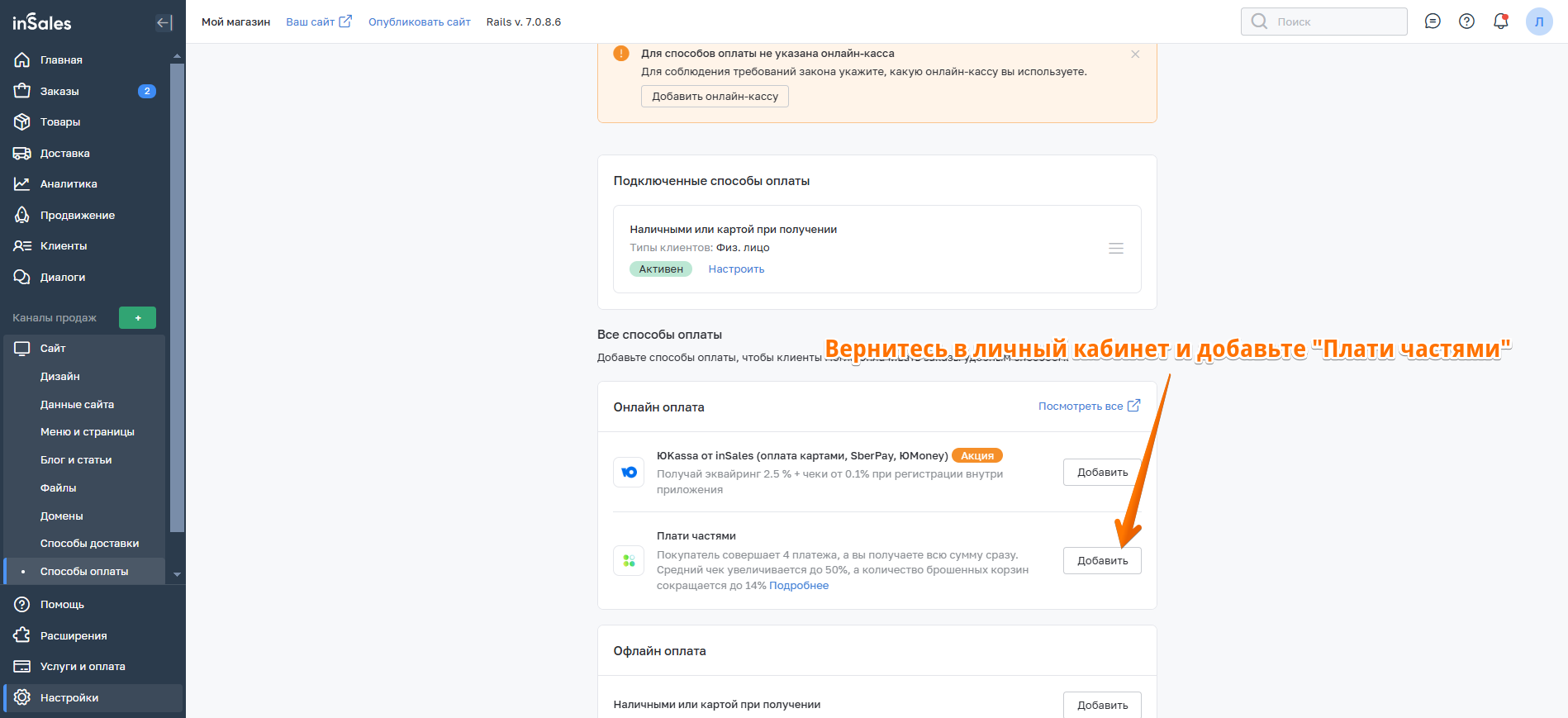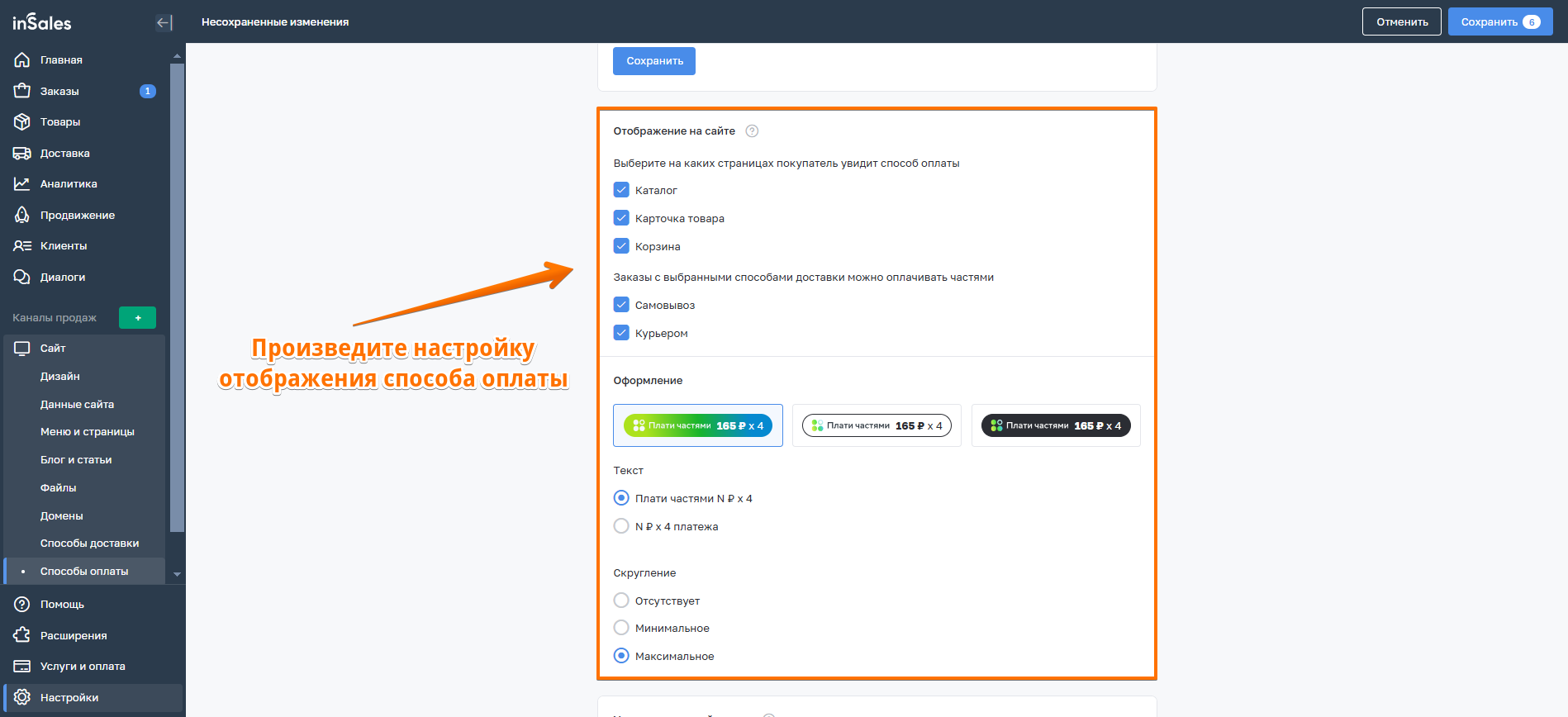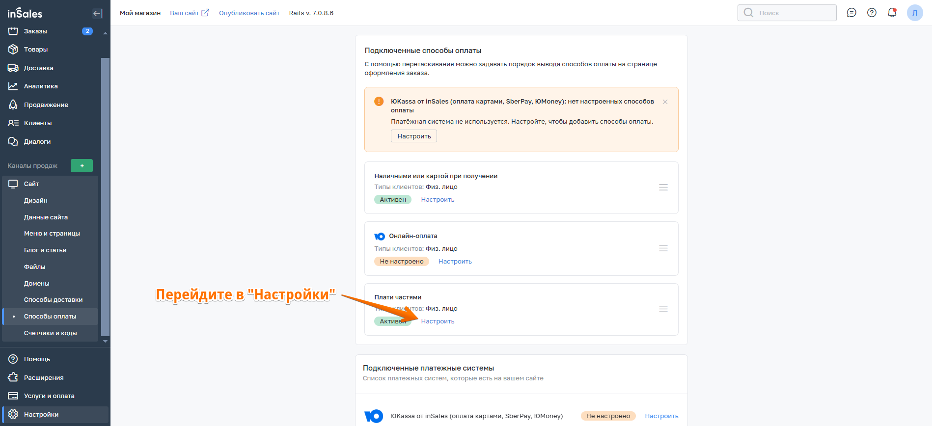 3. Далее перейдите к настройкам способа оплаты в inSales.