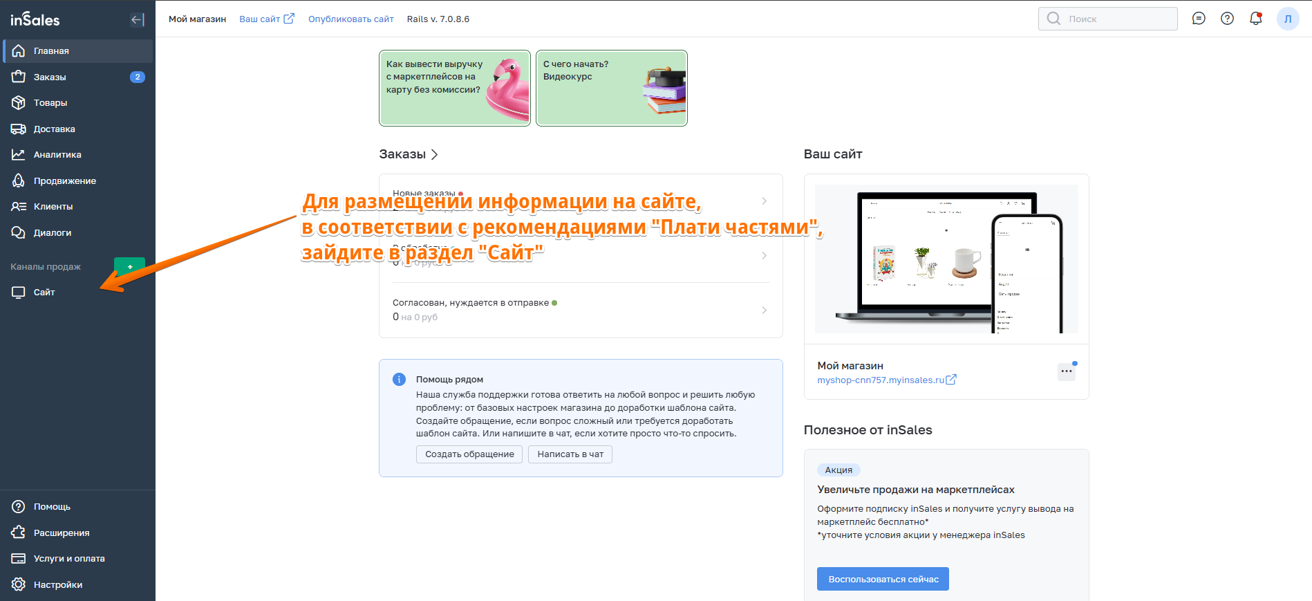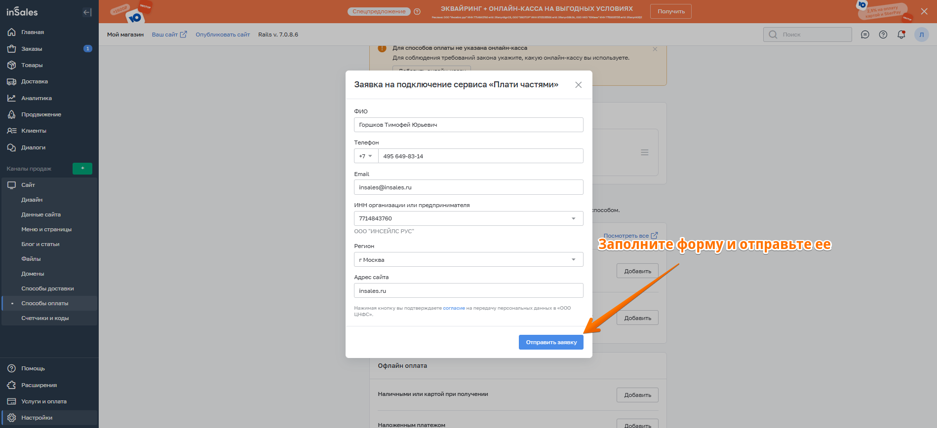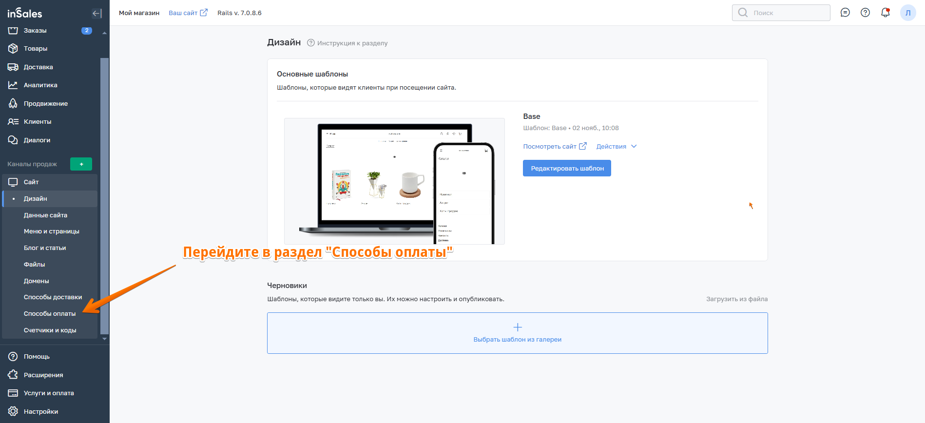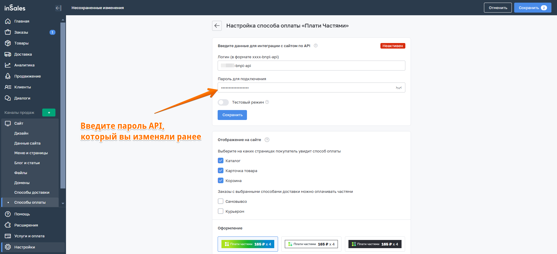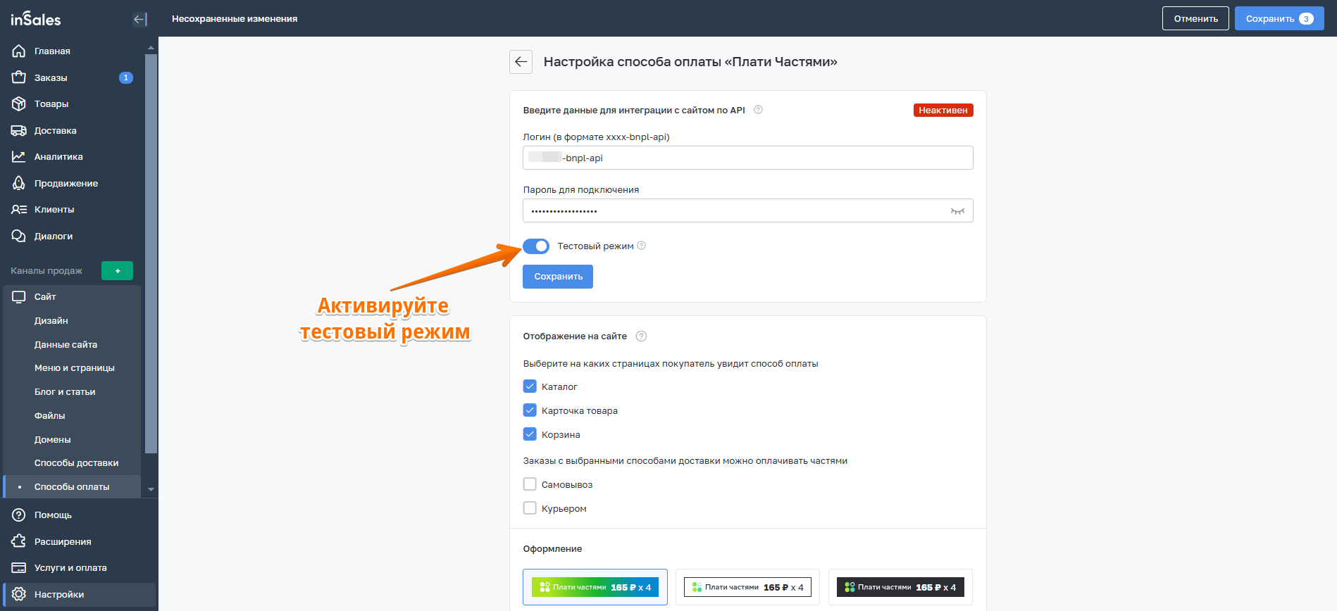 3. Далее перейдите к настройкам способа оплаты в inSales.