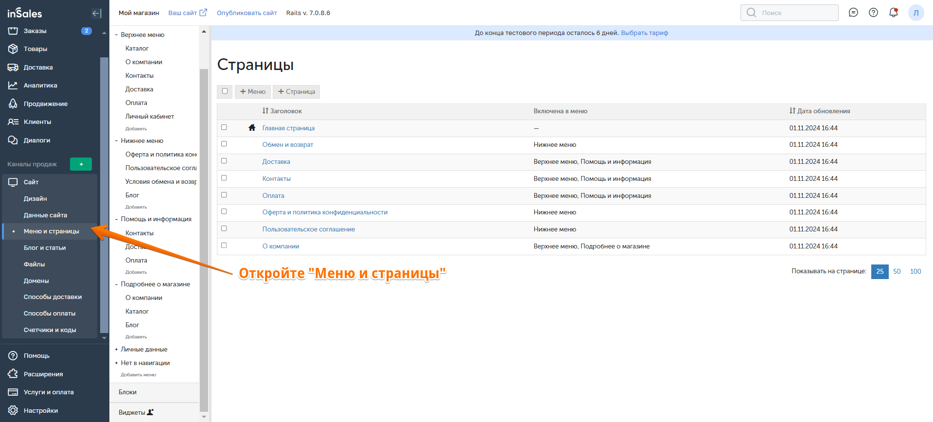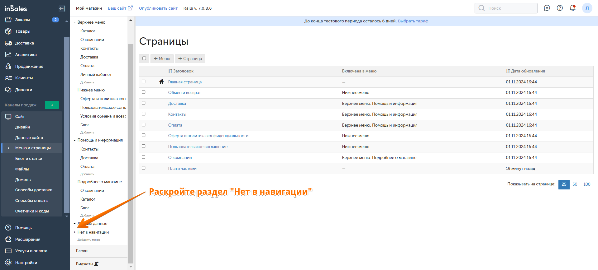 В панели администратора перейдите в раздел Сайт → Меню и страницы. В секции "Нет в навигации" появится страница "Плати частями". Удерживая название страницы, перенесите ее в подходящее меню сайта: