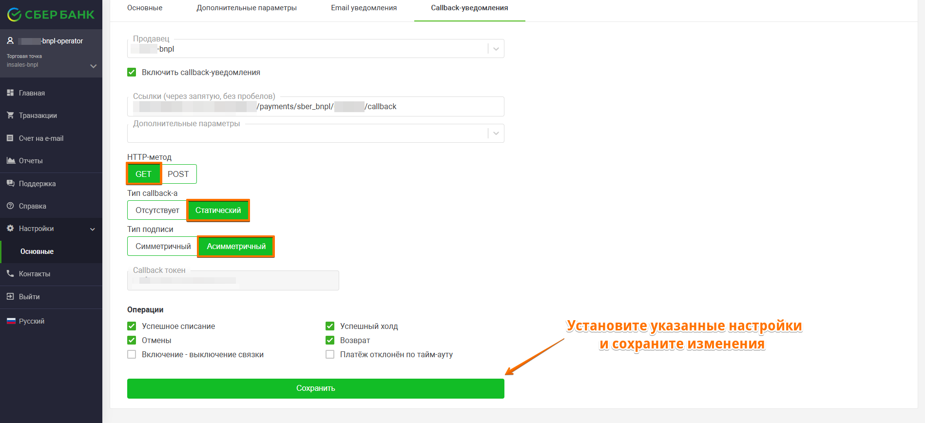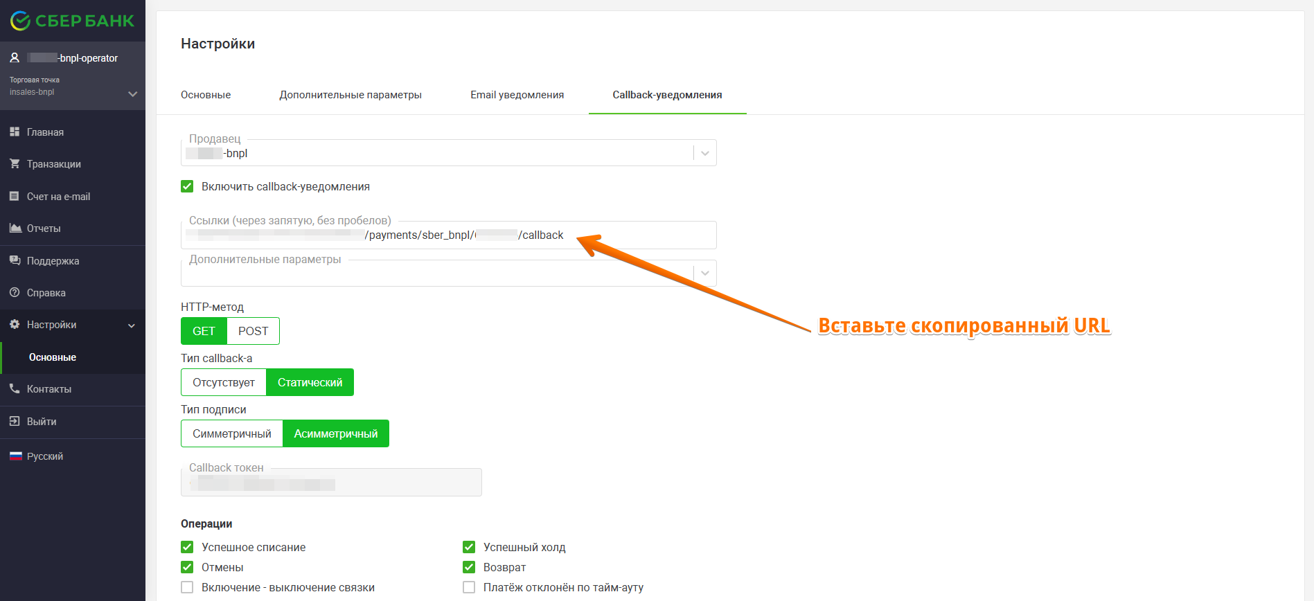 В разделе "Настройки → Callback-уведомления" вставьте скопированную ссылку.