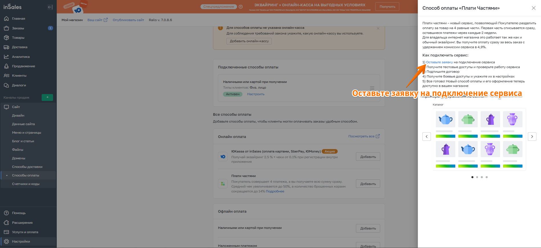 Для подключения сервиса "Плати частями" необходимо отправить заявку.