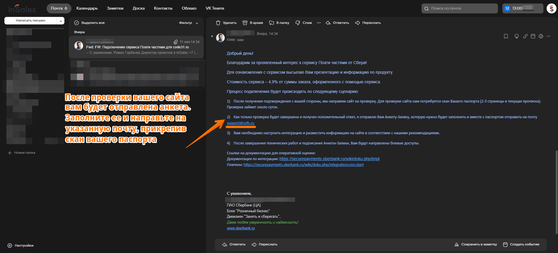 6. Далее необходимо ожидать письма от менеджера Сбера. Если письмо не пришло, проверьте папку "Спам".