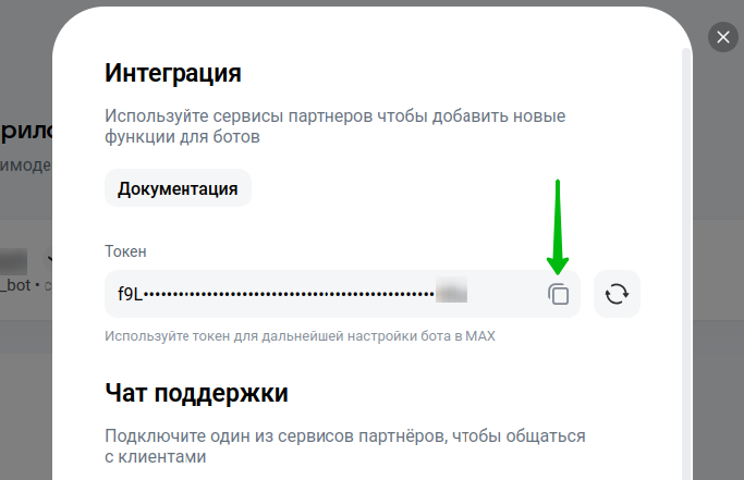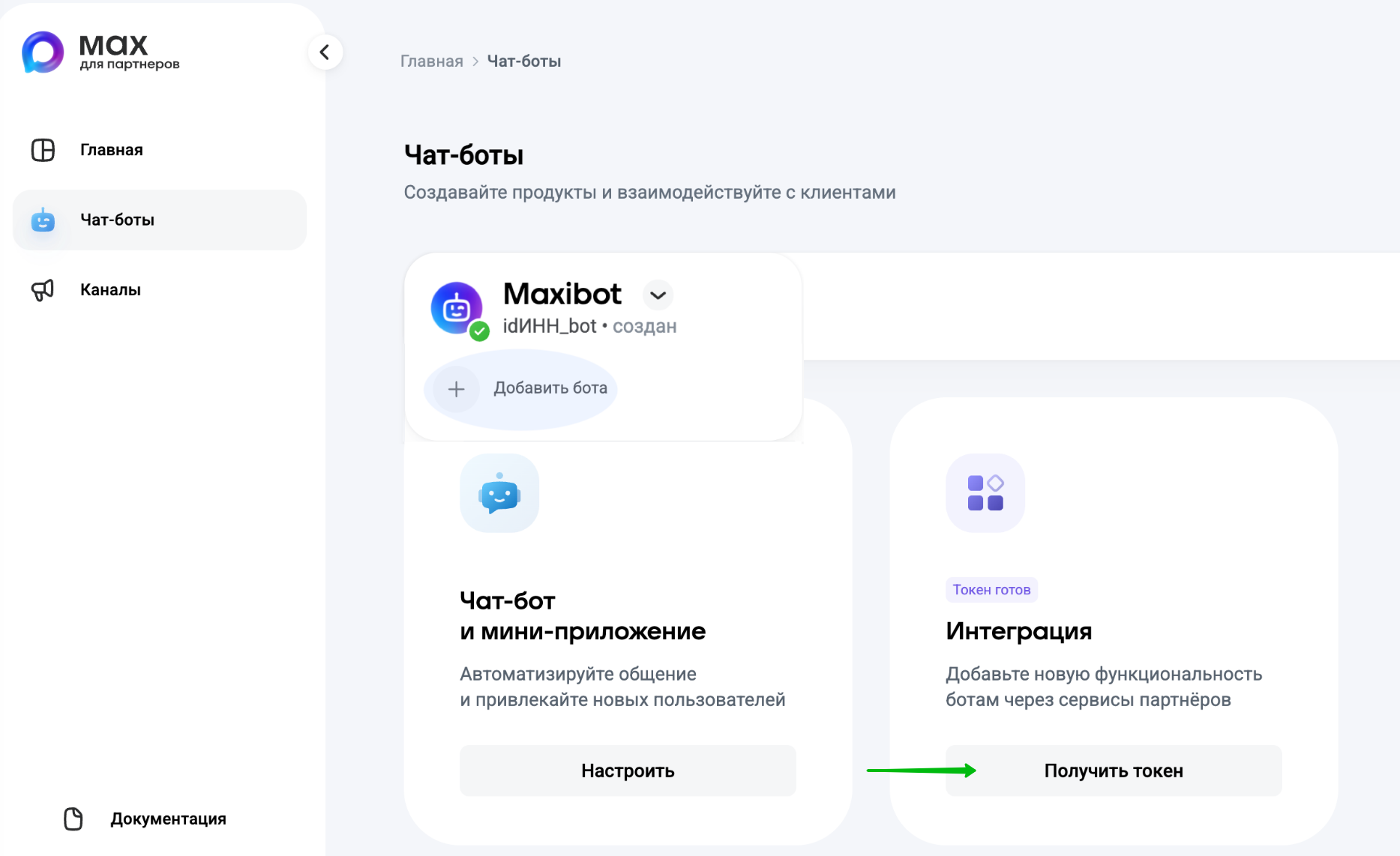 1. После успешной проверки статус бота сменится на "Создан", и появится доступ к его токену. Нажмите "Получить токен":