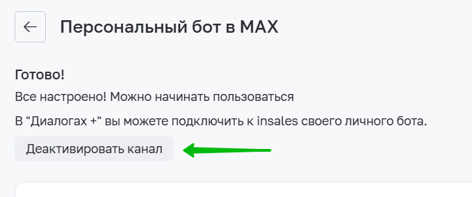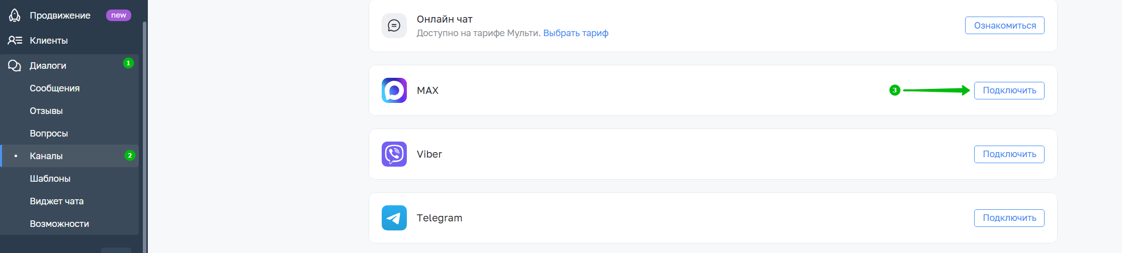 3. Перейдите в inSales в раздел Диалоги → Каналы и напротив мессенджера MAХ нажмите "Подключить":