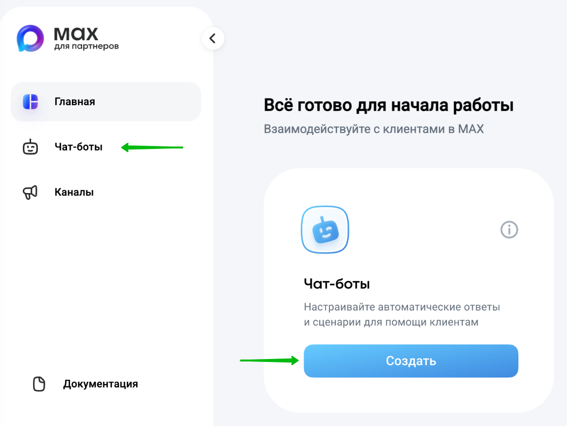 1. Перейдите в раздел "Чат-боты" или нажмите "Создать" в блоке "Чат-бот":