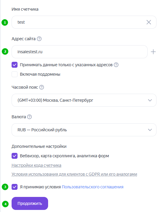 1. Создайте новый счетчик в Метрике. Укажите наименование счетчика, адрес сайта магазина и примите условия пользовательского соглашения.
