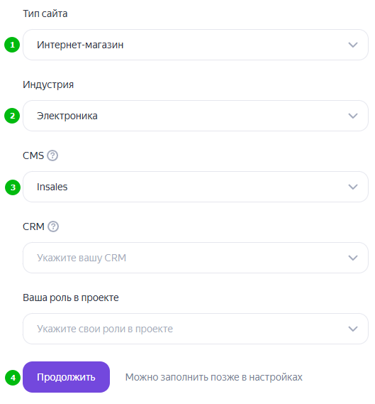 2. Укажите в качестве типа сайта "Интернет-магазин", подходящий тип индустрии и в поле "CMS" - "Insales".