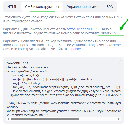 3. Выберите вкладку "CMS и конструкторы" и скопируйте номер счетчика: