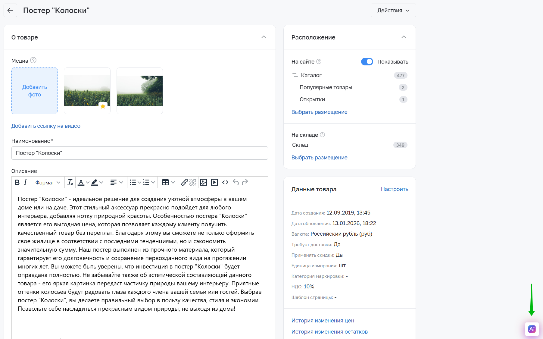 При заполнении полей "Описание" и "Дополнительное описание" можно воспользоваться генерацией текста. Текст будет сгенерирован на основе названия товара и заполненных характеристик в карточке товара.