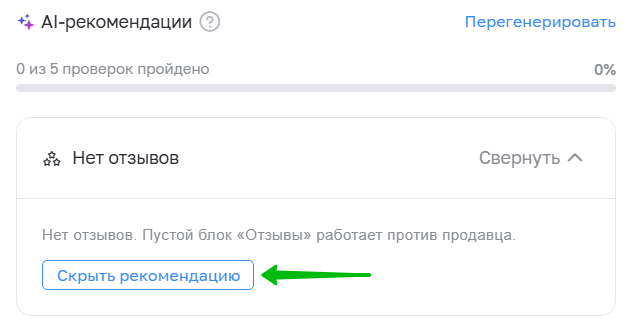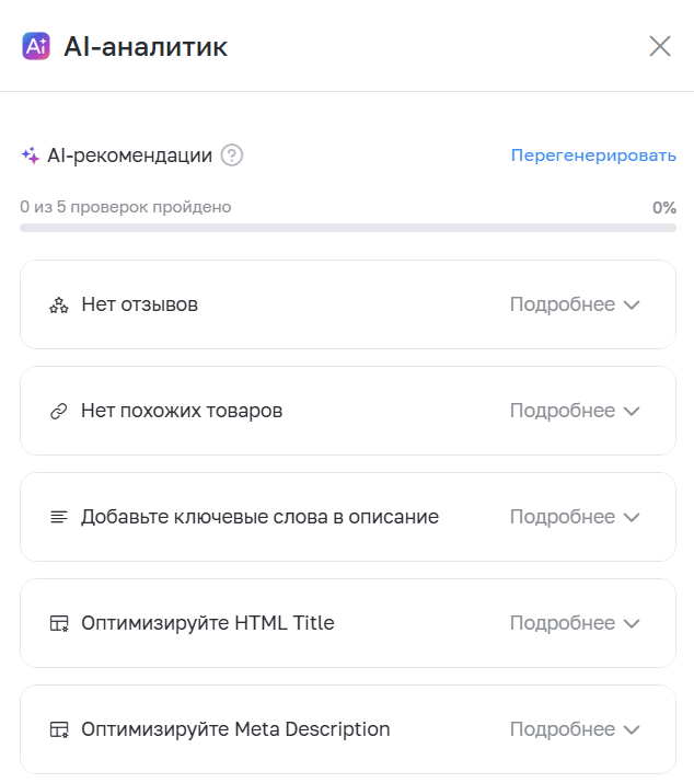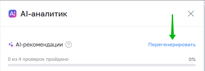 Для проверки и ревью карточки товара на вопрос полноценности и качества ее заполнения можно воспользоваться встроенным AI-аналитиком.