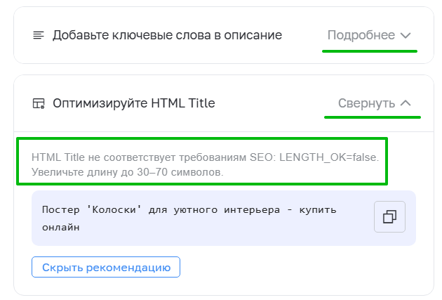 4. Изучите подробное пояснение для каждой рекомендации и внесите правки в карточку товара: