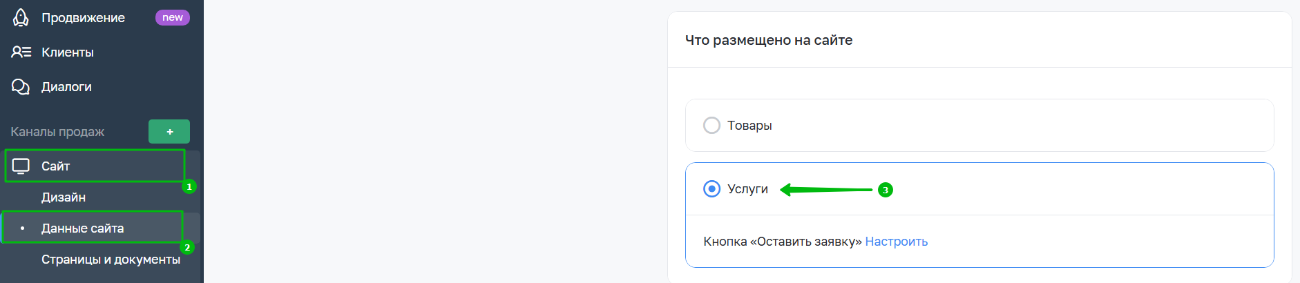 1. Для этого перейдите в раздел Сайт → Данные сайта и в блоке "Что размещено на сайте" укажите "Услуги":