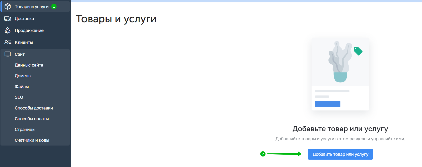 3. Далее в разделе Товары и услуги можно будет добавить услугу: