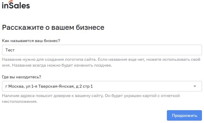 5. Укажите название бизнеса, выберите, если нужно, адрес и нажмите "Продолжить".