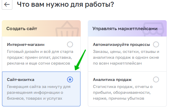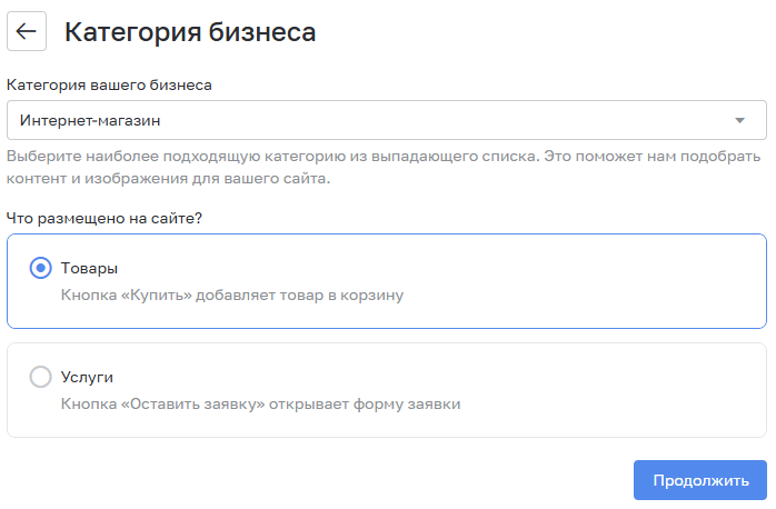 Для покупки товара покупателю нужно будет положить его в корзину, для покупки услуги — заполнить и отправить форму. В дальнейшем выбор можно будет изменить в настройках сайта. Нажмите "Продолжить".