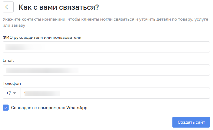 Указанные контакты будут записаны в раздел данных сайта и выведены на сайте-визитке. Затем нажмите "Создать сайт".