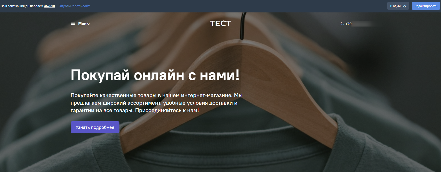 Пока сайт находится в режиме редактирования и не опубликован, можно поделиться ссылкой для его предварительного просмотра. Доступ к сайту по ссылке получат только те, кто знает пароль. Пароль для входа отображается слева в верхней панели в режиме предпросмотра.