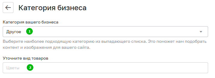 6. Выберите категорию бизнеса и тип ассортимента на сайте: товары или услуги.
