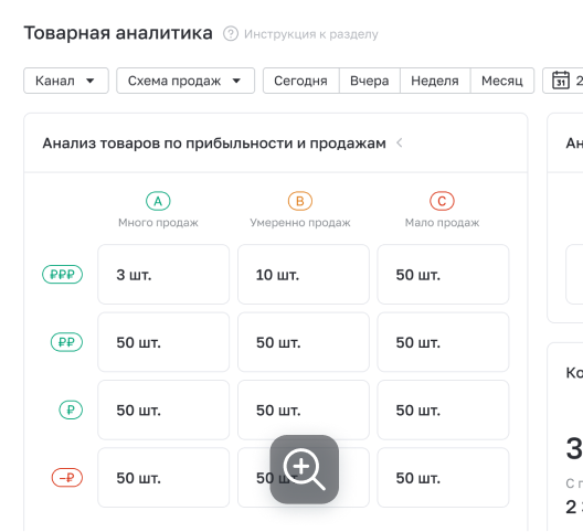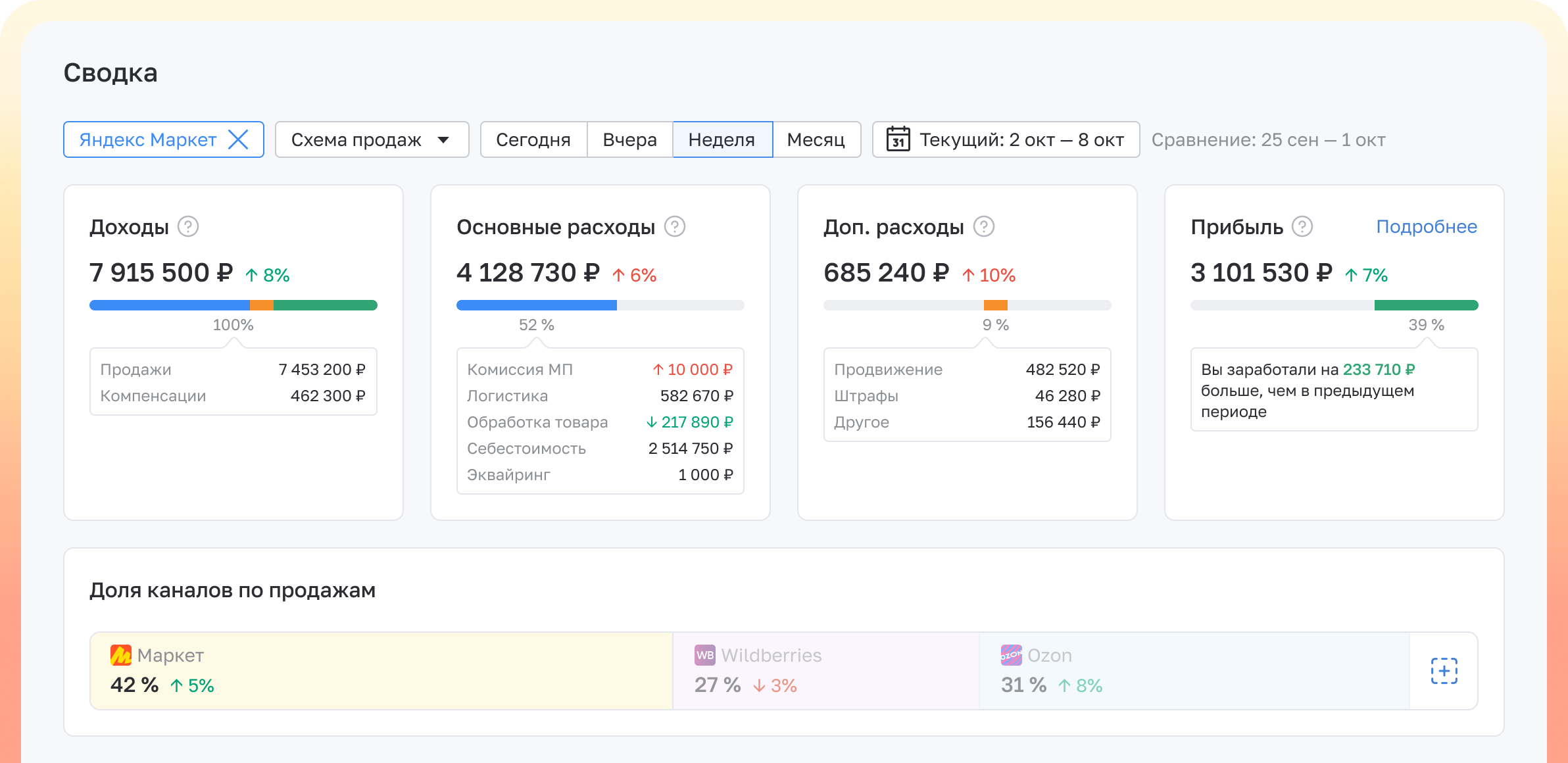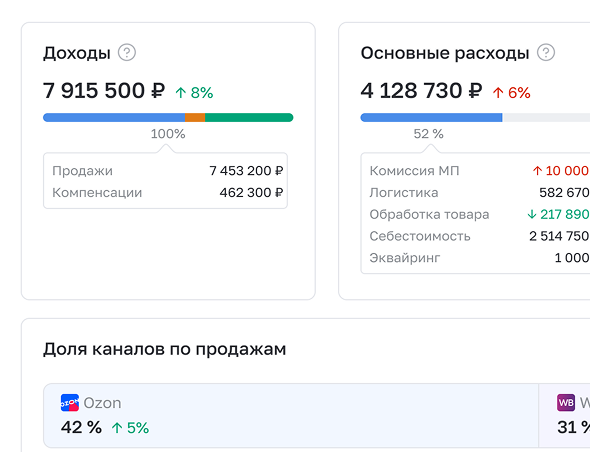 Зарабатывайте больше благодаря анализу ключевых показателей продаж со всех маркетплейсов, не тратя время на объединение данных из разных личных кабинетов.